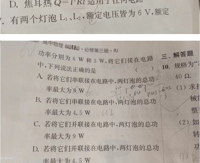 可以用直接用P=UI求电功率,但是U=6,是小灯泡L2的电压,此时L1的电压为3V,电路总功率P=UI=(3+6)×0.5=4.5W。你提到的“B选项为什么不可以直接用p等于UI 等于6×0.5W 等于3W?”求得是小灯泡L2的功率,而不是电路总功率。