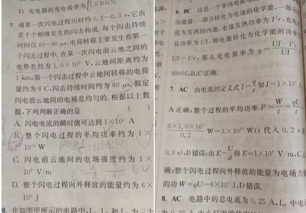1.安徽 11月2号 物理《高中物理小题狂做新教材必修第三册》人教版 第七题B选项为什么不可以用p平均等于UI/t  U等于1×10的9次方 I等于1×10的5次方 所以b不就是对的了吗?